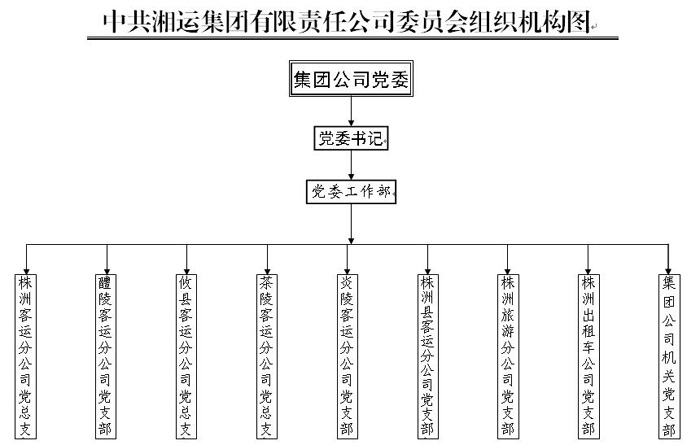 中共湘運(yùn)集團(tuán)有限責(zé)任公司委員會(huì),隸屬于中共株洲市非公有制經(jīng)濟(jì)組織工委。黨委會(huì)常設(shè)工作機(jī)構(gòu)黨委工作部。全司共有中共黨員304名。下轄株洲客運(yùn)分公司黨總支、醴陵客運(yùn)分公司黨支部、攸縣客運(yùn)分公司黨總支、茶陵客運(yùn)分公司黨總支、炎陵客運(yùn)分公司黨支部、株洲縣客運(yùn)分公司黨支部、株洲旅游分公司黨支部、株洲出租車(chē)公司黨支部、集團(tuán)公司機(jī)關(guān)黨支部共9個(gè)二級(jí)基層黨組織。