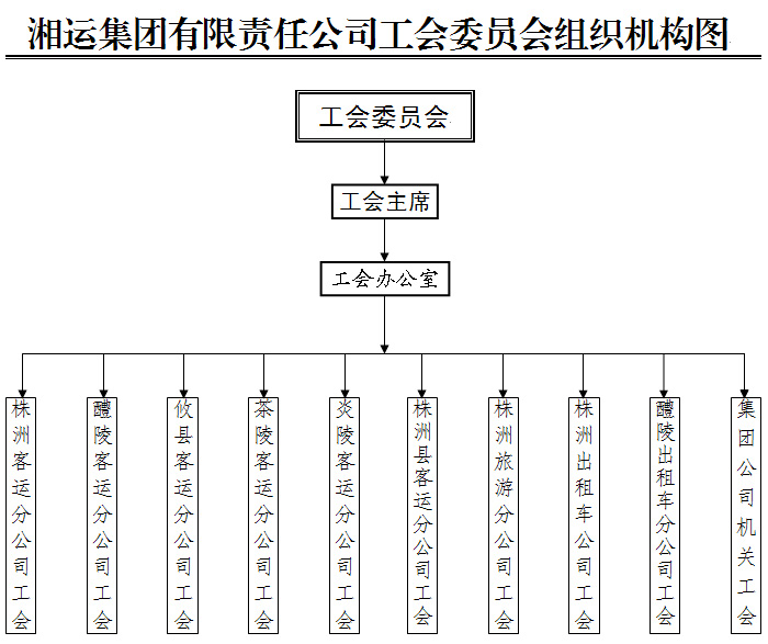 湘運集團有限責任公司系湖南省株洲地區(qū)最具規(guī)模、舉足輕重的專業(yè)化道路運輸龍頭企業(yè),是以運輸產(chǎn)業(yè)為主,房地產(chǎn)開發(fā)、商貿(mào)餐飲等為輔的多元化經(jīng)營的企業(yè)集團。集團公司設工會委員會,下設9個二級工會,現(xiàn)有工會會員1026人,員工入會率達100%。
