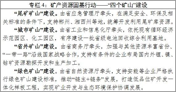 統(tǒng)籌開展鋰電池及先進(jìn)儲(chǔ)能材料產(chǎn)業(yè)所需鋰、錳、鎳等主要礦產(chǎn)資源調(diào)查評(píng)價(jià)及勘查,加強(qiáng)新能源礦產(chǎn)資源儲(chǔ)備和統(tǒng)籌開發(fā)利用。建設(shè)“尾礦礦山”,在滿足安全、環(huán)保及相關(guān)標(biāo)準(zhǔn)的條件下,支持開發(fā)利用尾礦庫資源。建設(shè)“城市礦山”,依托現(xiàn)有循環(huán)經(jīng)濟(jì)示范園區(qū)、省級(jí)化工園區(qū),有序建設(shè)一批電池回收綜合利用示范基地。加強(qiáng)與其他資源豐富省份戰(zhàn)略合作,支持有條件的企業(yè)布局建設(shè)“省外礦山”,提升資源供應(yīng)保障能力。