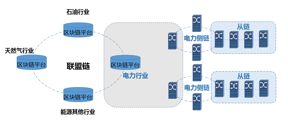 “主、側、從”多鏈混合架構模式能夠適應體量大、業(yè)務雜、數據并發(fā)率高的能源行業(yè),并且具有良好的節(jié)點擴展性與可靠性。其中,主鏈覆蓋能源領域各企業(yè),提供基于區(qū)塊鏈的跨企業(yè)數據交互和共享服務;側鏈向能源領域某一行業(yè)進行延伸,覆蓋行業(yè)內相關企業(yè),支撐主鏈更廣范圍覆蓋、更全面數據交互應用;從鏈則以實際業(yè)務應用需求為導向,進行應用擴展,支撐主、從鏈實現應用的全覆蓋。