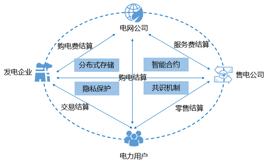 市場化的電費結算是能源交易的核心業(yè)務,我國的電費結算技術開始于1960年,隨后被廣泛應用于各行各業(yè)。目前,我國普遍采取“預購電”方式結算電費,但這種模式對分布式新能源接入等多種新場景,存在能量流、信息流不統(tǒng)一,交易流程長、響應不及時、合同履約難掌控、信用體系難建立等問題。