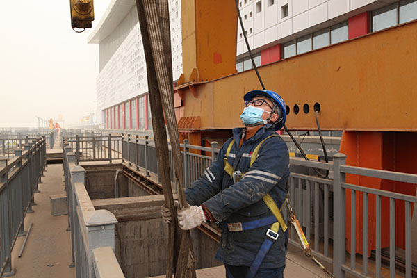 一線職工地面指揮起重門機運行