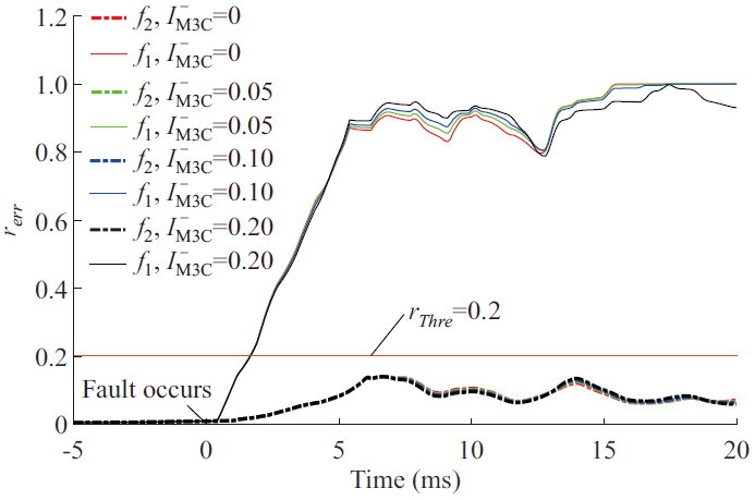 本文對圖1所示的帶有3個(gè)風(fēng)電場的低頻輸電系統(tǒng)進(jìn)行了仿真。計(jì)算結(jié)果表明:1)如圖3所示,區(qū)外故障時(shí),由本端模量信息計(jì)算的電壓反行波在故障暫態(tài)階段基本與由對端模量計(jì)算的電壓反行波重合,區(qū)內(nèi)故障下二者差異明顯;2)不同M3C負(fù)序電流指令下的電壓反行波差異仿真結(jié)果如圖4所示,結(jié)果表明,基于電壓反行波差異的縱聯(lián)保護(hù)在區(qū)內(nèi)故障時(shí)在能在5 ms內(nèi)可靠動(dòng)作,而在區(qū)外故障時(shí)不動(dòng)作。所提保護(hù)不受換流器故障控制策略影響,且具有較高的靈敏度。