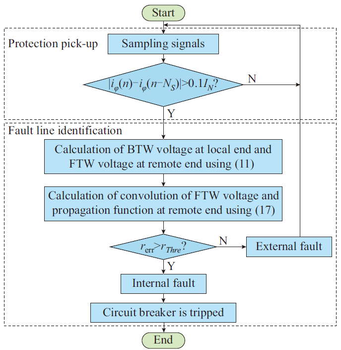 典型的換流器故障控制策略雖能弱化故障特征,但在故障暫態(tài)階段,故障特征主要受到海纜中電容和電感間能量交換的影響。同時(shí),換流器控制系統(tǒng)完成指定目標(biāo)需要一定時(shí)間,因此故障支路電流在故障暫態(tài)階段幅值較大并逐漸減小。充分利用該階段的故障信息,即可實(shí)現(xiàn)故障識(shí)別。鎧裝三芯海纜包含導(dǎo)芯、金屬屏蔽層和鎧裝,多導(dǎo)體之間存在電磁耦合,單獨(dú)分析相電氣量困難。對此,首先利用時(shí)域暫態(tài)信號(hào)相模變換,篩選出能夠反映各種故障類型的模量。Marti模型考慮了線路頻變特性,能夠根據(jù)對端電壓前行波準(zhǔn)確計(jì)算本端電壓反行波。為了在低采樣率下實(shí)現(xiàn)計(jì)算,推導(dǎo)了基于插值的高精度電壓反行波電壓表達(dá)式?;陔妷悍葱胁ú町惖暮I巷L(fēng)電低頻輸電系統(tǒng)海纜縱聯(lián)保護(hù)方案流程圖如圖2所示。保護(hù)啟動(dòng)后,首先根據(jù)本端模量信息計(jì)算本端電壓反行波,然后通過對端電壓前行波與傳播函數(shù)間的卷積來計(jì)算本端電壓反行波,最終比較二者差異以實(shí)現(xiàn)海纜保護(hù)。