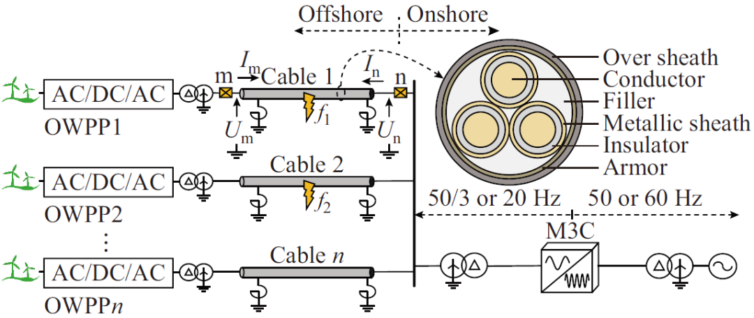圖1給出了海上風(fēng)電低頻輸電系統(tǒng)拓?fù)?,海纜需匯集來自于風(fēng)電場的電能,并經(jīng)模塊化多電平矩陣換流器(modular multilevel matrix converter,M3C)實(shí)現(xiàn)頻率轉(zhuǎn)換,從而在M3C低頻側(cè)構(gòu)成了100%電力電子源場景。相較于同步機(jī)系統(tǒng)在負(fù)序網(wǎng)絡(luò)中源側(cè)只體現(xiàn)阻抗特性,低頻輸電系統(tǒng)負(fù)序網(wǎng)絡(luò)中線路兩側(cè)均可體現(xiàn)為電源特性。根據(jù)單相接地故障和兩相相間故障復(fù)合序網(wǎng)圖,故障支路電流可由負(fù)序電流唯一確定,當(dāng)M3C和海上風(fēng)電場網(wǎng)側(cè)變流器(grid-side converter, GSC)抑制負(fù)序電流時(shí),盡管故障點(diǎn)處存在負(fù)序電壓源,但兩側(cè)換流器均會(huì)生成幅值相位相同的電壓源,以抵消系統(tǒng)中的負(fù)序電流,因此系統(tǒng)故障電流仍保持對稱,使得故障支路的穩(wěn)態(tài)電流為0。上述分析表明,雖然風(fēng)電場升壓變壓器和M3C低頻側(cè)隔離變壓器網(wǎng)側(cè)中性點(diǎn)均采取直接接地方式,但低頻輸電系統(tǒng)在特定故障控制策略下呈現(xiàn)出類似于中性點(diǎn)非直接接地系統(tǒng)的故障特征。