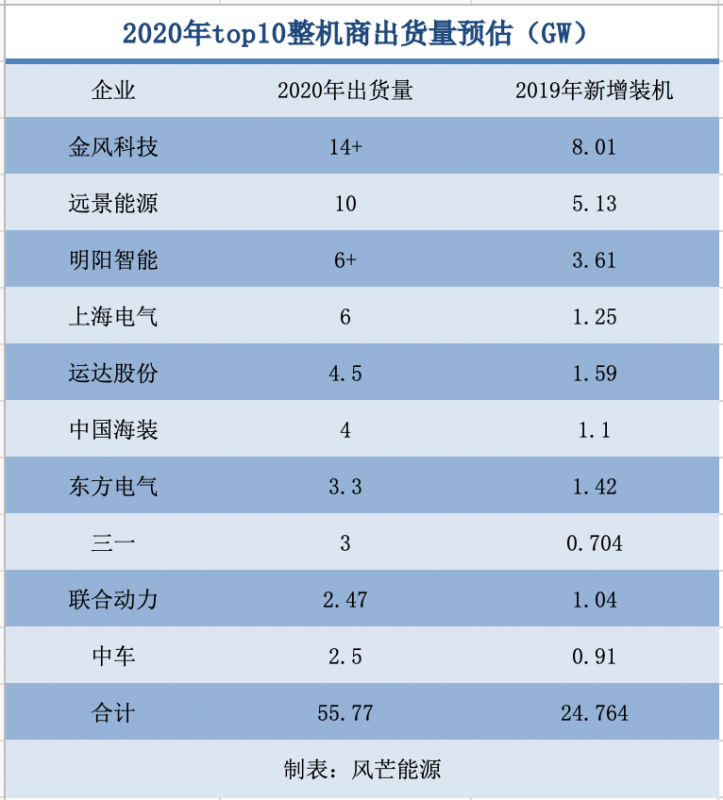 根據(jù)風芒能源問詢、統(tǒng)計以及預估,2020年全年,排名前十的整機商出貨量將超過50GW左右。相較于光伏行業(yè)動態(tài)變化的集中趨勢,風電整機商的排名及市占率基本保持穩(wěn)定。其中,TOP3的整機商金風科技、遠景能源、明陽智能累計出貨量超過30GW,三家市場占比最終預計在60%左右,與2019年的62.6%比,雖受搶裝影響,三家市占率稍有減弱,但行業(yè)集中度基本未受影響。