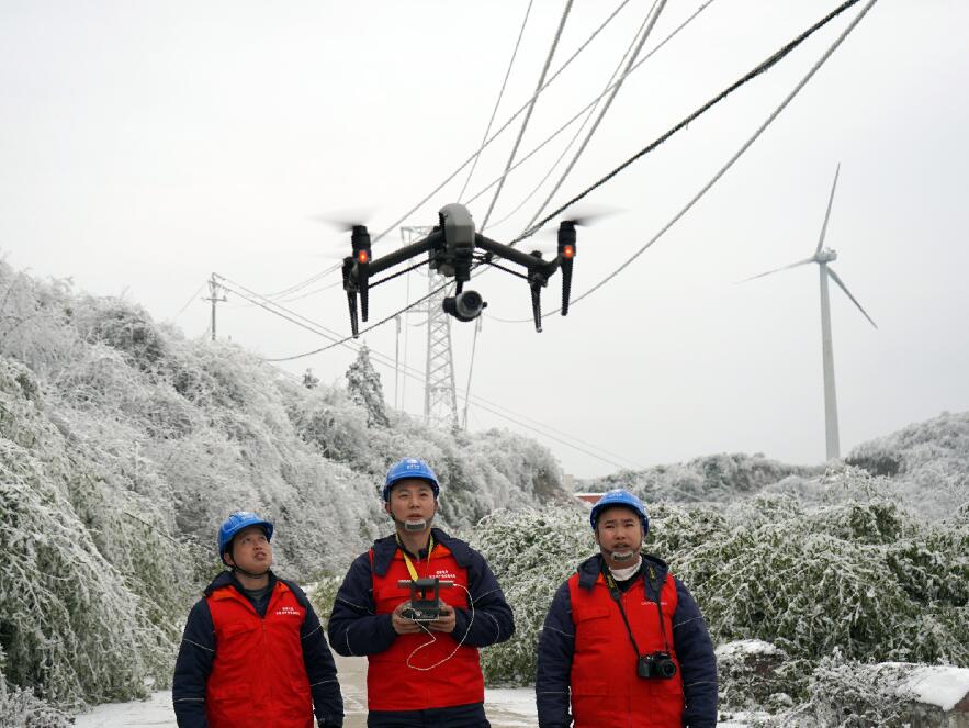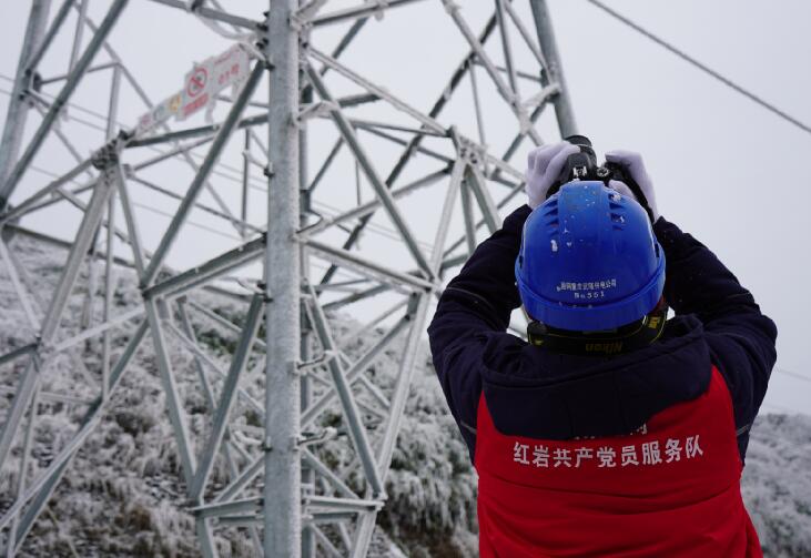 中國電力網(wǎng)訊 “110千伏四黎線今日最大覆冰厚度7.9毫米,目前風(fēng)速3.5米每秒,溫度零下4度……”“小心一點(diǎn),要走兩邊有草叢的地方,中間的道路結(jié)冰了,容易滑倒。”1月9日,國網(wǎng)重慶武隆供電公司輸電運(yùn)維檢修班成員吳鼎、趙樓等人來到武隆區(qū)和順鎮(zhèn)四眼坪鄉(xiāng)對覆冰線路開展特殊巡視。在白雪皚皚的四眼坪,國家電網(wǎng)紅巖共產(chǎn)黨員服務(wù)隊(duì)隊(duì)服的顏色成了冰雪世界里最靚麗的一抹紅,他們手拿著無人機(jī)、砍刀、繩索、望遠(yuǎn)鏡、風(fēng)速儀等設(shè)備再一次踏入他們熟悉的“冰雪戰(zhàn)場”。