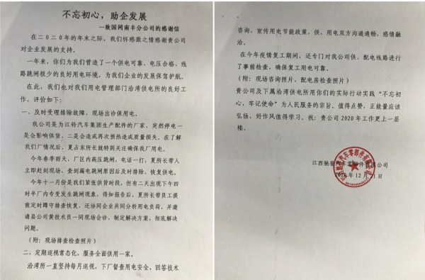 中國(guó)電力網(wǎng)訊 12月21日,國(guó)網(wǎng)南豐縣供電公司收到江西馳譽(yù)汽車(chē)零部件有限公司送來(lái)的感謝信,對(duì)該公司提供的良好用電環(huán)境表示衷心感謝。