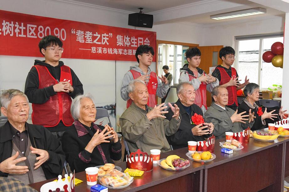 這是慈溪市白果樹社區(qū)第四屆“8090”耄耋老人集體生日會(huì)的現(xiàn)場。在重陽節(jié)來臨之際,浙江慈溪市錢海軍志愿服務(wù)中心攜同白果樹社區(qū)和寧波大學(xué)科學(xué)技術(shù)學(xué)院,為社區(qū)內(nèi)30余名80歲以上老人們準(zhǔn)備了蛋糕、壽面和精彩的節(jié)目表演,提前給老人們過一個(gè)集體生日。