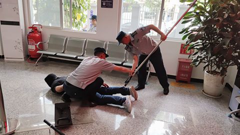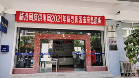 在反恐怖襲擊演練中,本次演練以該局鳳慶營業(yè)廳內突然出現(xiàn)2名不明身份窮兇極惡的持刀恐怖分子,挾持1名安保人員為演練假定場景。演練營業(yè)廳值班人員信息報告、應急響應啟動、人身救援、通訊聯(lián)絡等現(xiàn)場應急處置過程。演練現(xiàn)場, 2名持刀窮兇極惡的恐怖分子以辦事為由,在保安人員正當詢問及登記之際,恐怖分子手持管制刀具強行推開營業(yè)廳門闖入廳內,企圖用砍刀襲擊現(xiàn)場保安工作人員并直奔營業(yè)廳平臺破壞電力營業(yè)收費管理正常秩序。營業(yè)廳工作人員立即向應急辦值班室匯報,應急辦主任聽取應急辦值班室匯報后,立即做出啟動生產(chǎn)辦公場所反恐怖襲擊事件(四級)應急響應的決定,安排有關保安和工作人員對現(xiàn)場進行處置,保安人員并及時持盾牌、鋼叉等警用設備與暴徒對峙,采取應急處置措施,終將恐怖分子制服。