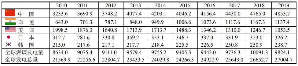 2010~2019年燃煤發(fā)電前五位國(guó)家狀況(單位:TWh)