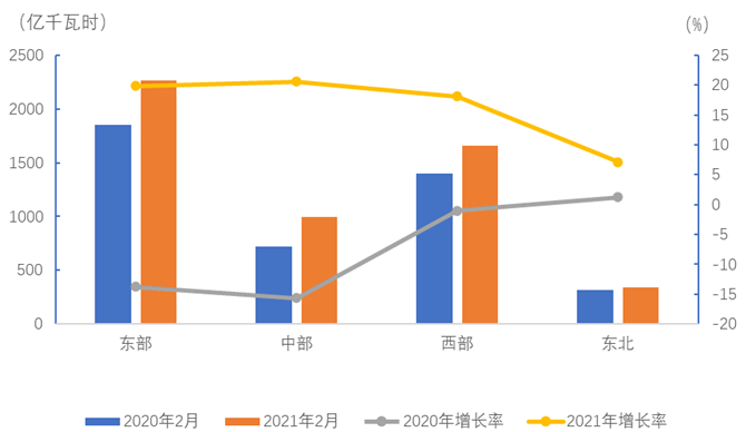 1-2月,東、中、西部和東北地區(qū)②全社會用電量分別為5657、2407、3754和770億千瓦時,增速分別為27.0%、20.8%、19.2%和10.0%。