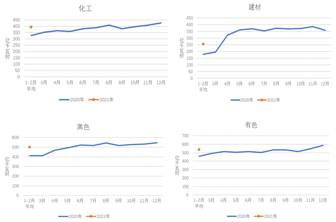 1-2月,化工行業(yè)用電量790億千瓦時,同比增長14.3%,增速比上年同期提高22.1個百分點;建材行業(yè)用電量512億千瓦時,同比增長39.4%,增速比上年同期提高57.8個百分點;黑色金屬冶煉行業(yè)用電量1006億千瓦時,同比增長18.8%,增速比上年同期提高21.6個百分點;有色金屬冶煉行業(yè)用電量1074億千瓦時,同比增長12.7%,增速比上年同期提高13.9個百分點。