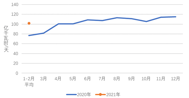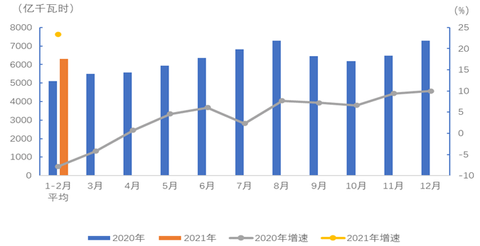 1-2月,全國全社會用電量12588億千瓦時,同比增長22.2%。