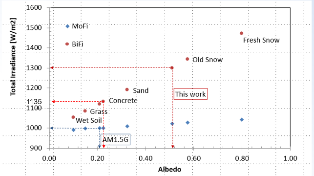 圖1中縱軸包括兩個(gè)關(guān)鍵點(diǎn):1300w/m²和1135w/m²。135w/m²對(duì)應(yīng)于IEC 60904-3中定義的環(huán)境條件下雙面組件離地高度1米時(shí)背面所接受到的平均輻照度?;诖说玫降碾p面組件在BNPI條件下的測(cè)試結(jié)果不僅與傳統(tǒng)STC條件下的結(jié)果具有良好的兼容性,并且使在相同的條件下對(duì)雙面和單面組件的光伏性能進(jìn)行直接對(duì)比成為可能。除此外,BNPI條件下的性能測(cè)試結(jié)果也可以為組件選型和系統(tǒng)設(shè)計(jì)提供具有價(jià)值的參考信息。由于背面發(fā)電,雙面組件在戶外通常比單面組件產(chǎn)生更高的電流。較高的電流可能導(dǎo)致光伏組件局部溫度過高,特別是在發(fā)生電流聚集的區(qū)域。因此新版2021版 61215標(biāo)準(zhǔn)中的相關(guān)測(cè)試條件相應(yīng)進(jìn)行了修訂來反映出雙面組件在戶外高電流的情況。1300w/m²是綜合各種不同應(yīng)用場(chǎng)景下可能達(dá)到的背面輻照度的極端情況、實(shí)際應(yīng)用中這些場(chǎng)景的出現(xiàn)概率而確定的一個(gè)較為合理的強(qiáng)度,從圖1中也可以看出1300w/m²這個(gè)點(diǎn)已經(jīng)能覆蓋絕大部分的地表反射率,可以被認(rèn)為是一個(gè)合理的針對(duì)雙面組件可靠性驗(yàn)證測(cè)試的背面輻照度。