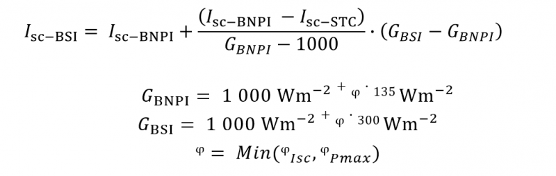由于太能能模擬器可能達(dá)不到測(cè)試BSI的要求,因此可以用低輻照度下的電性能參數(shù)來推算高輻照度下的電性能參數(shù),公式如圖6所示: