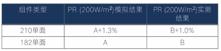 模擬結(jié)果顯示210組件低輻照性能PR200W/m2較182組件高1.3%
