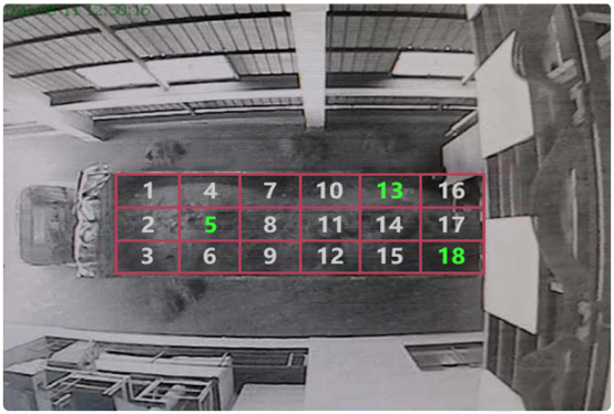 通過攝像頭的實(shí)時(shí)畫面,基于深度學(xué)習(xí)物體檢測(cè)車輛,捕捉貨車車廂上頂蓋平面,用線條等分,繪制18個(gè)子采樣區(qū)域,并對(duì)子區(qū)域進(jìn)行編號(hào),直觀展示采樣分布。